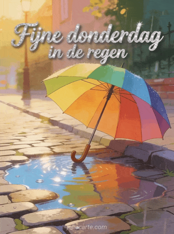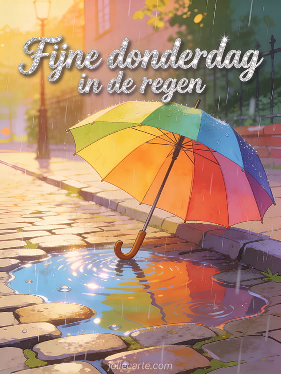 Deel fijne donderdag in de regen met krachtige cursieve letters, zilveren schittering, een kleurrijke paraplu naast glinsterende plassen, natte kasseien en warm omgevingslicht. Bekijk ook gratis fijne donderdag afbeeldingen, goedemorgen fijne donderdag afbeelding of goedemorgen fijne donderdag kusjes afbeeldingen.