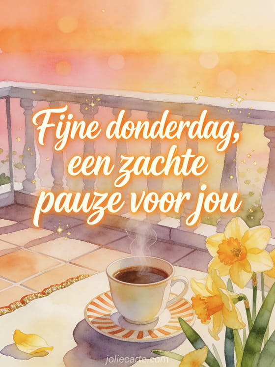 Deel een zachte donderdagpauze met een dampend koffiekopje op een betegeld terras, heldere narcissen en warme zonsopgangskleuren. Je kunt ook fijne donderdag vrienden afbeelding, fijne donderdag ochtend afbeeldingen of goedemorgen donderdag citaat delen.