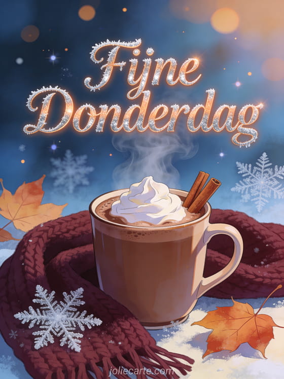 Warm een koude donderdag op met deze gezellige kaart met een dampende kop warme chocolade met kaneel en rijpkristallen op herfstbladeren. Ontdek ook foto fijne donderdag of fijne dag op donderdag.