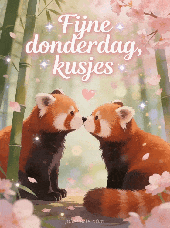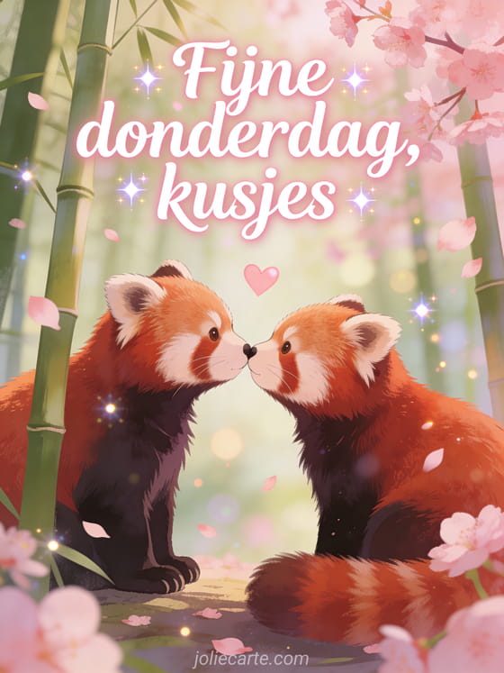 Deel een fijne donderdag kusjes afbeelding met twee schattige rode panda's die hun neuzen tegen elkaar houden in een bamboebos terwijl roze kersenbloesems vallen. Stuur meer warme wensen met goedemorgen het is donderdag afbeelding, fijne donderdag fijne dag of fijne donderdag afbeeldingen.