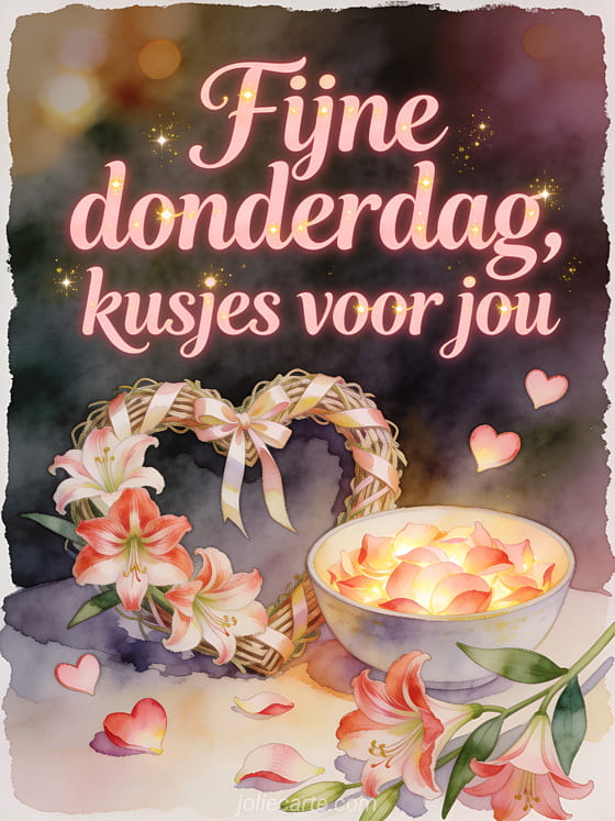 Stuur fijne donderdag kusjes afbeeldingen met roze letters, een hartkrans van lint, amaryllisbloemen en een schaal met gloeiende bloemblaadjes. Bekijk ook goedemorgen fijne donderdag landschap, mooie donderdag kusjes of een fijne dag donderdag afbeelding.