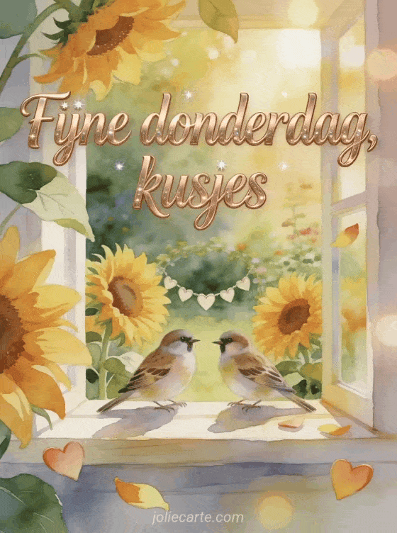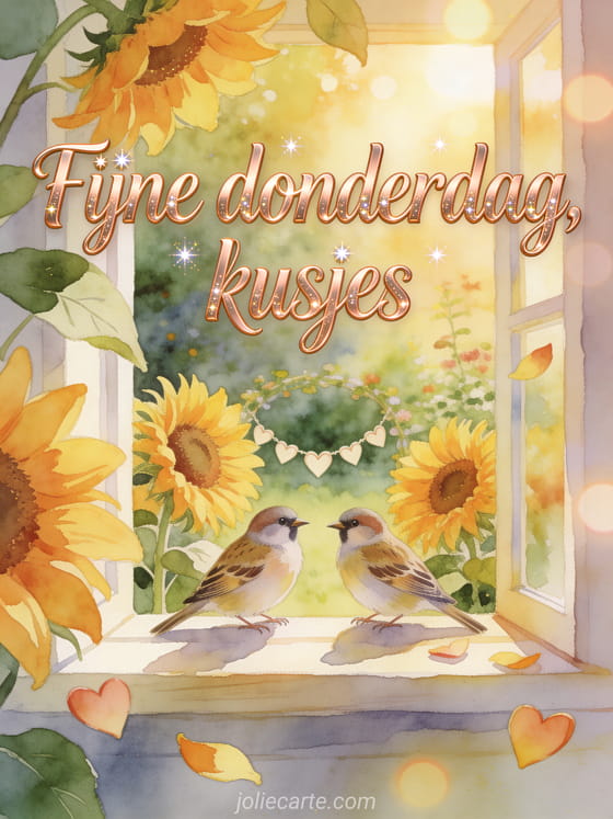 Deel een lichte fijne donderdaggroet met kusjes, zonnebloemen en een zachte aquareltuin. Bekijk ook fijne donderdag allemaal afbeeldingen, goedemorgen donderdag gif of gratis virtuele fijne donderdag kaarten.