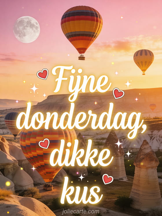 Verstuur fijne donderdag kusjes geanimeerde gifs met lichtgevende witte sierletters, gouden halo's, rode hartjes en kleurrijke luchtballonnen bij zonsopgang in Cappadocië. Deel een romantische wens voor doordeweeks en ontdek ook fijne donderdag mooie kaart, fijne donderdag gif of fijne regenachtige donderdag gif.