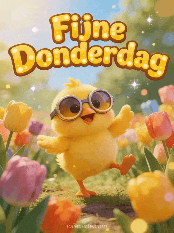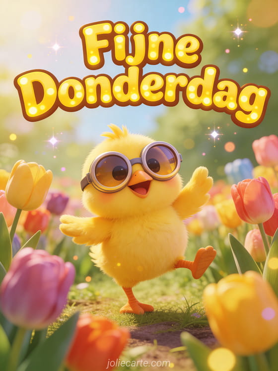 Stuur een vrolijke fijne donderdag gif met een cheerful geel kuiken met grote ronde brilletjes dat danst tussen tulpen. Ontdek ook een fijne regenachtige donderdag kaart of een fijne zonnige donderdag kaart.