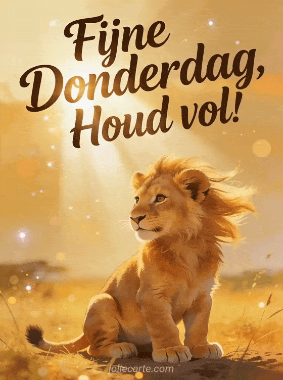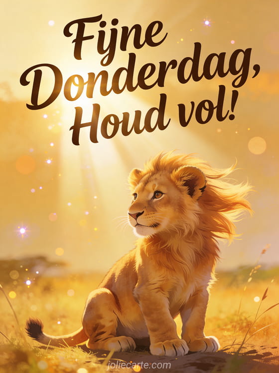Deel een krachtige donderdaggroet met een majestueuze leeuwenwelp die trots zit in het gouden savanneicht. Ontdek ook een mooie dag van donderdag of een fijne donderdag zen kaart.