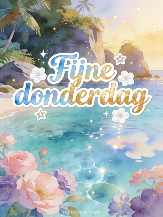 Verstuur fijne donderdag mooie kaart met pastelblauwe en gouden aquarelletters, fonkelende sterren en witte bloemen boven een paradijselijke turquoise baai. Deel een betoverende wens voor doordeweeks en ontdek ook fijne donderdag gif, fijne regenachtige donderdag gif of goedemorgen fijne donderdag sport afbeelding.