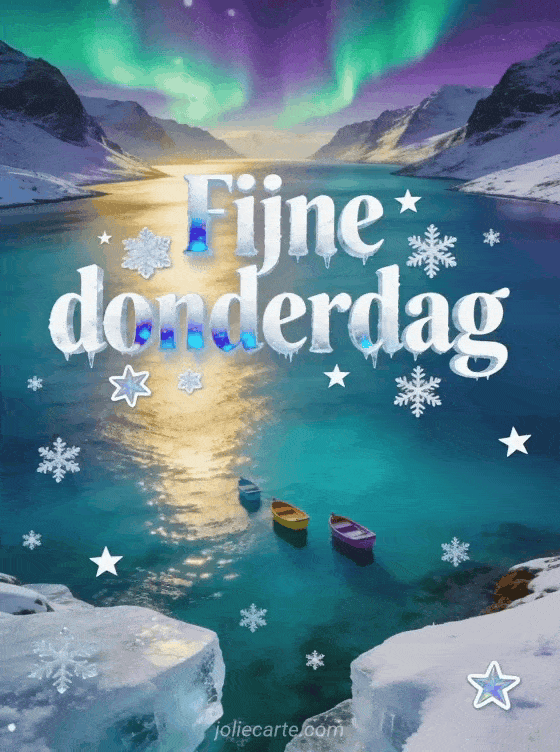 Deel een panoramische kaart voor fijne donderdag met ijzig witte letters, arctisch blauwe reflecties, sneeuwvlokken, bevroren sterren, een turquoise fjord tussen besneeuwde bergen, kleurrijke bootjes op kalm water en groen en paars noorderlicht aan de hemel. Bekijk ook fijne donderdag vrouw afbeeldingen, goedemorgen donderdag afbeeldingen of deze afbeelding om een fijne donderdag te wensen.