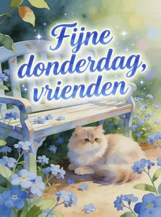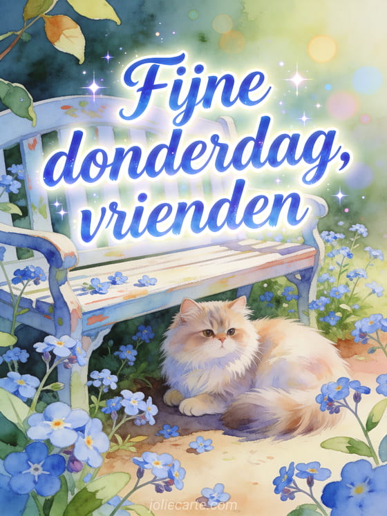 Deel fijne donderdag met vrienden via een heldere aquarelkaart met een pluizige Perzische kat bij een tuinbankje en vergeet-mij-nietjes. Bekijk ook fijne donderdag ochtend afbeeldingen, goedemorgen donderdag citaat of fijne donderdag geanimeerde afbeelding.
