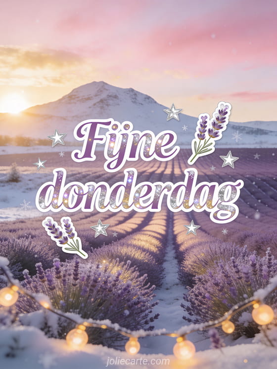Verstuur fijne donderdag vrouw afbeeldingen met elegante lavendelviolette letters, zilveren rijpglans en een eindeloos lavendelveld voor een besneeuwde berg. Deel een poëtische wens voor doordeweeks en ontdek ook goedemorgen donderdag afbeeldingen, afbeelding om een fijne donderdag te wensen of donderdag kusjes afbeeldingen.