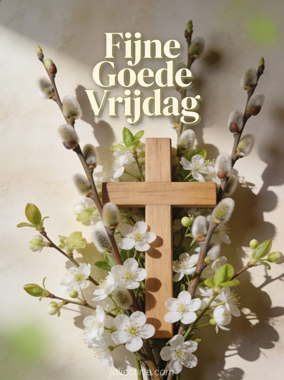 Stuur een serene Goede Vrijdag kaart met een eenvoudig houten kruis omringd door knoppen van wilgentakken en witte lentebloemen. Ontdek ook een fijn paasweekend kaart of een paasweekend kaart.