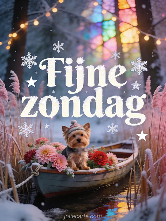 Stuur een gezellige kaart voor fijne zondag met crèmekleurige ijsletters, sneeuwvlokken, ijzige sterren en een bloemenroeiboot in bevroren riet, waar een lieve Yorkshire Terriër hond met een mutsje tussen roze en rode dahlia's zit. Ontdek ook goedemorgen fijne zondag gif, goedemorgen fijne zondag kaart of fijne zonnige zondag kusjes.