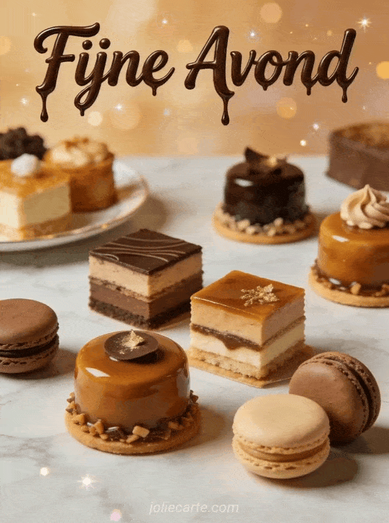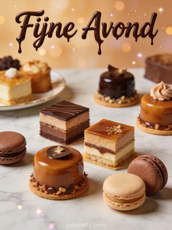 Stuur een heerlijke fijne lekkerbekken avond groet via deze gratis wenskaart. Een assortiment gourmet desserts en macarons op een marmeren tafel, een verwennende zoete sfeer met warme karamel en chocolade tinten, perfect voor zoetekauwen. Bekijk ook een tekst voor fijne avond of een fijne avond en nacht humor.
