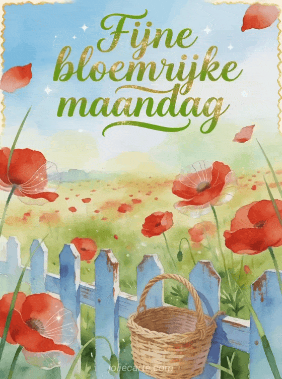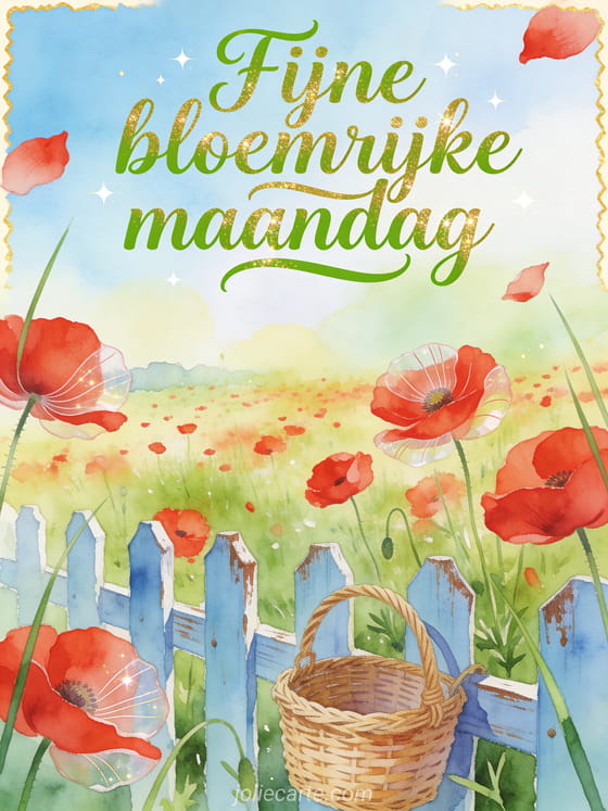 Wens een fijne bloemrijke maandag met een heldere aquarelweide op het platteland, rode klaprozen, een kleine rieten mand en een geschilderde omheining. Ontdek ook een kaart met besneeuwde fijne maandag afbeelding, fijne maandag goed begin van de week afbeeldingen of fijne maandag afbeeldingen gifs.
