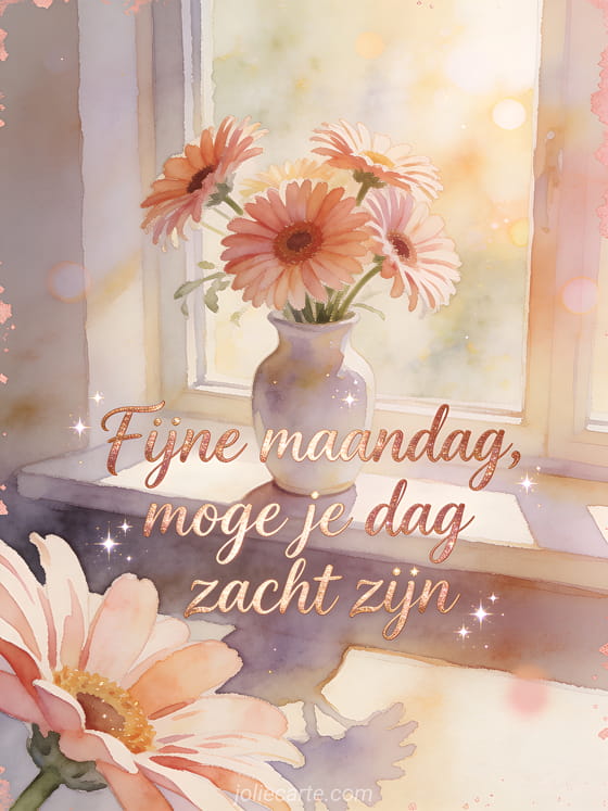 Wens een zachte fijne maandag met roségouden kalligrafie, een porseleinen vaas met gerbera's op een zonnige vensterbank en warm aquarellicht. Bekijk ook fijne maandag glitterende afbeelding, koude fijne maandag afbeelding of fijne maandag geanimeerde afbeeldingen.