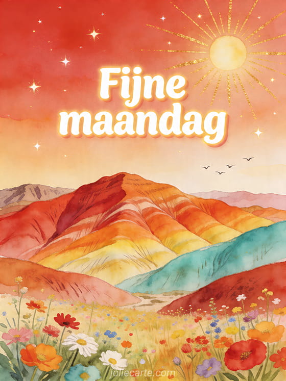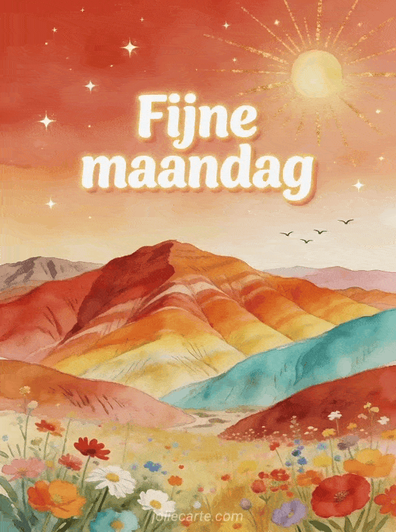 Stuur een stralende Fijne maandag groet met regenboogbergen, wilde bloemen en warm zonlicht. Bekijk ook fijne maandag kaart, goedemorgen van maandagochtend en geanimeerde fijne maandag gifs.