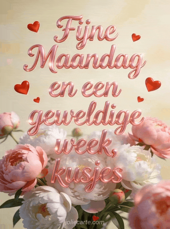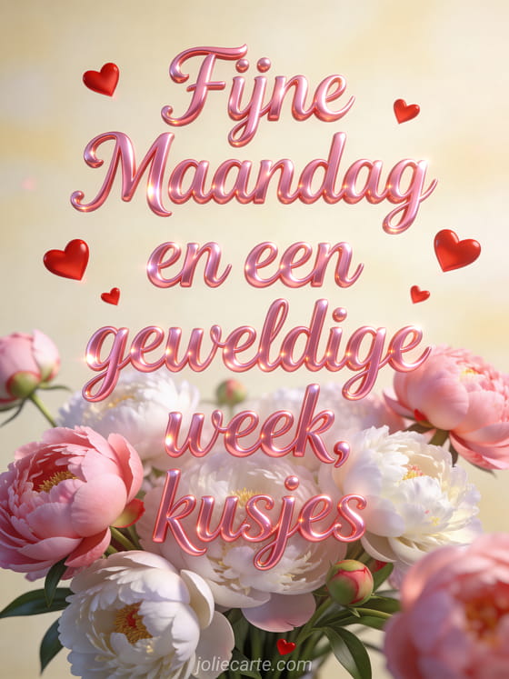 Fijne maandag en fijne week kusjes een tedere maandagskaart met hartjes en pioenrozen voor een geweldige week
