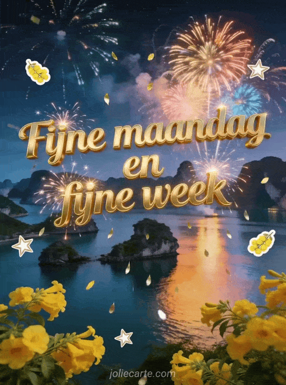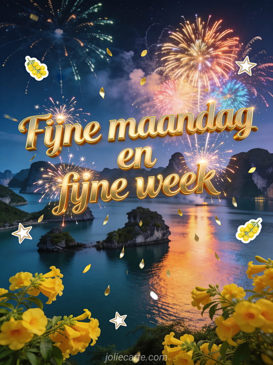Begin de week met een feestelijke fijne maandag boven de baai van Ha Long, met veelkleurig vuurwerk, gele mimosa en gouden reflecties op kalm water. Ontdek ook fijne maandag kusjes gifs, geanimeerde fijne maandag gifs of fijne week en fijne maandag gif.