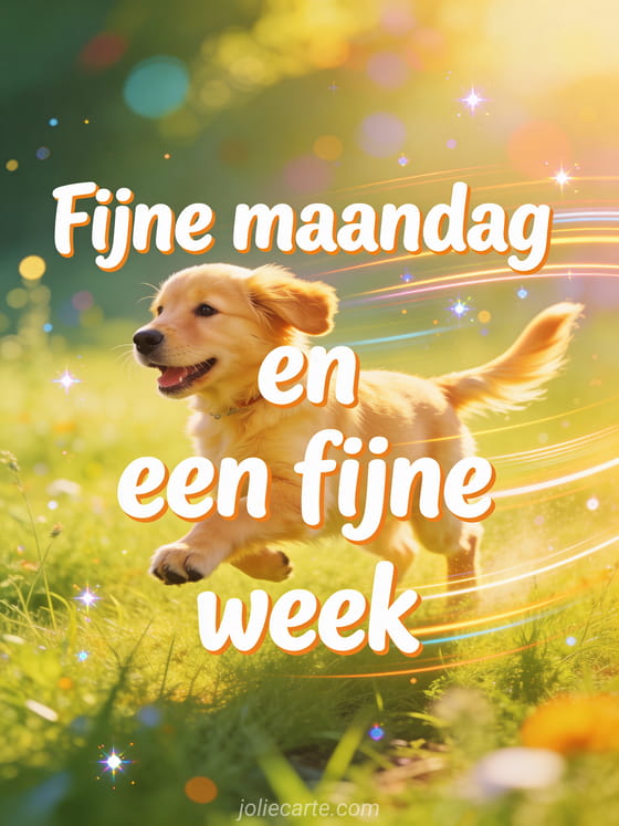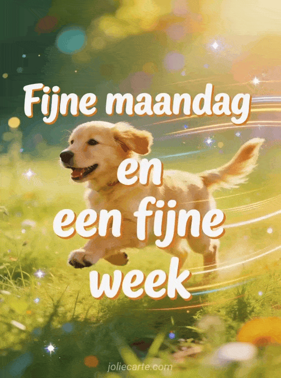 Stuur een energieke groet voor fijne maandag en een fijne week met letters in animatiestijl en een vrolijke golden retriever puppy die door een weide rent. Ontdek ook fijne maandag koffie afbeelding, fijne maandag goedemorgen fijne week of goedemorgen en fijne maandag gif.