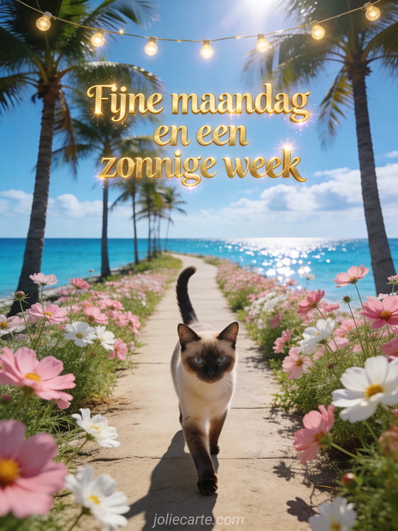 Stuur een vrolijke zonnige maandaggroet met wensen voor een mooie week. Een elegante Siamese kat wandelt op een pad langs azuurblauw water met roze en witte kosmosbloemen en lichtjes tussen de palmen. Bekijk ook fijne maandag dikke kus of humor moed fijne maandag.