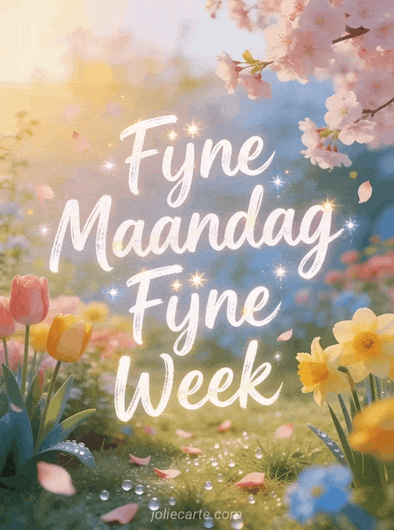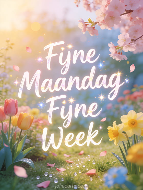 Stuur een vrolijke fijne maandag en fijne week wens met prachtige lentebloemen in een tuin. Ontdek ook een fijne maandag kaart.