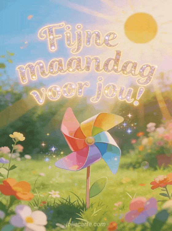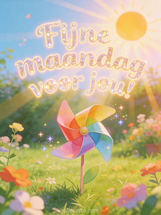 Stuur een vrolijke fijne maandag-groet met een kleurrijke windmolen in een zonnige tuin. Bekijk ook gratis afbeeldingen fijne maandag en fijne week, fijne maandag allemaal afbeeldingen of kaart fijne maandag kusjes.