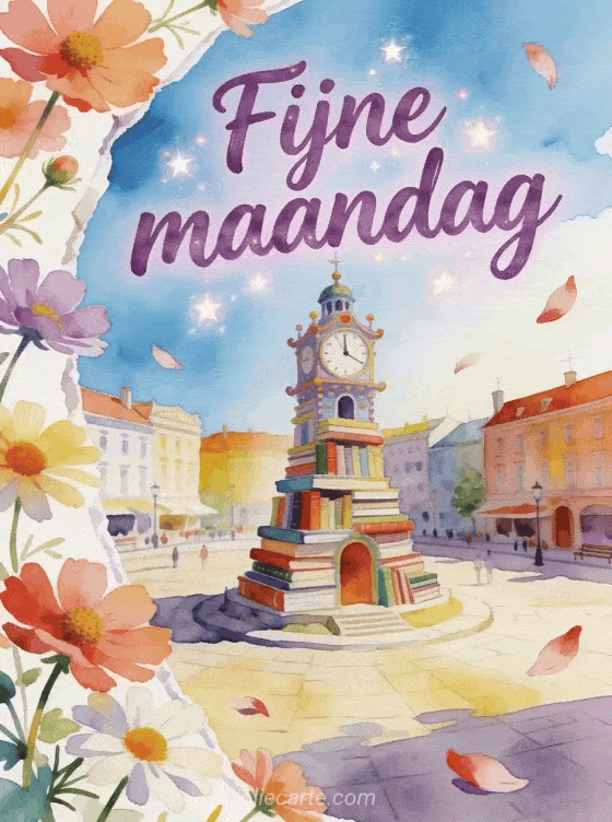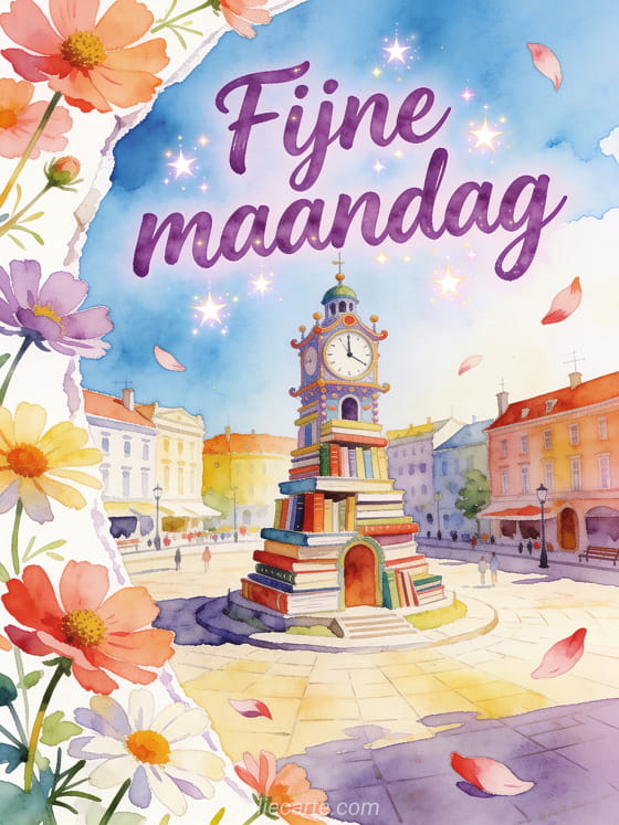 Stuur een fijne maandag vol kleur, met violette aquarelletters, kleine sterren en een speelse klokkentoren van boeken. Ontdek ook fijne maandag kusjes mooie afbeeldingen, fijne maandag citaat afbeelding of fijne maandag in de regen afbeelding.