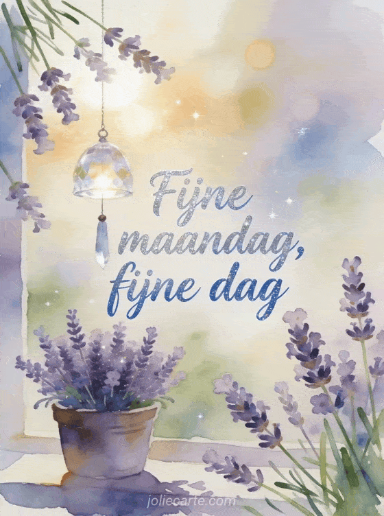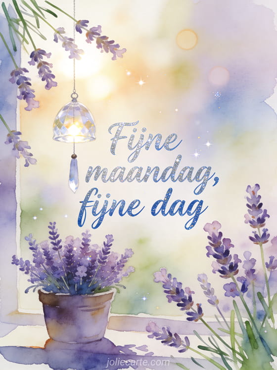 Stuur fijne maandag, fijne dag met zilverblauwe kalligrafie, een kristallen windgong in het zonlicht, een lavendelpot en glinsterend ochtendlicht. Ontdek ook koude fijne maandag afbeelding, fijne maandag geanimeerde afbeeldingen of fijne maandag mooie afbeeldingen.