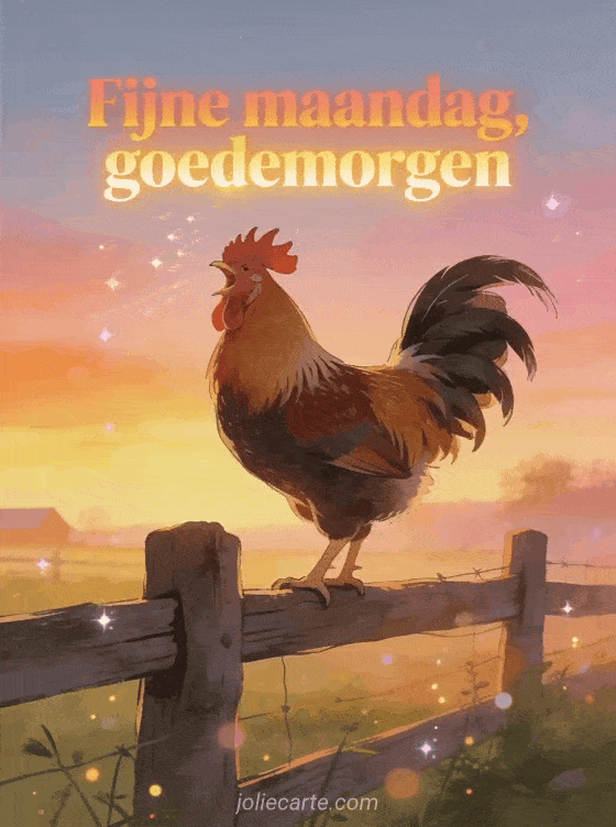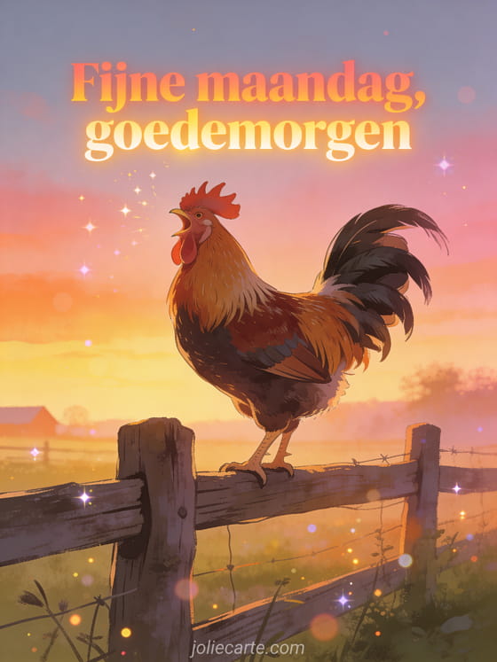 Stuur een heldere groet voor fijne maandag en goedemorgen met zonsopkomstletters en een haan die bij dageraad op een rustieke boerderijhek kraait. Ontdek ook goedemorgen en fijne maandag gif, gratis fijne maandag kaarten of fijne maandag en fijne week afbeelding.