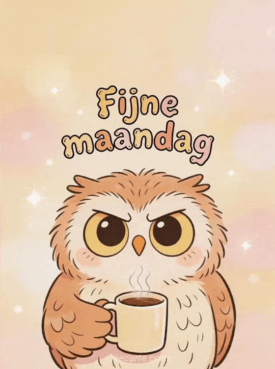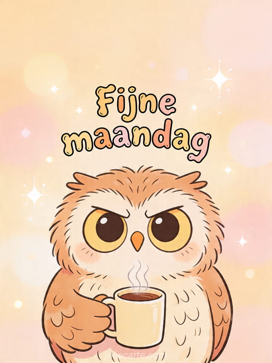Stuur een Fijne maandag kaart met een norse uil en een koffiemok om de ochtend lichter te maken. Bekijk ook fijne maandag en fijne week, hou vol fijne maandag en mooie fijne maandag afbeelding.