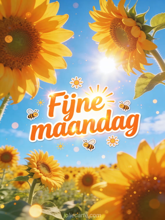 Verstuur fijne maandag humor geanimeerde gif met feloranje letters, kleine stralende zonnetjes, vrolijke bijen en een veld met reusachtige zonnebloemen onder een heldere blauwe lucht. Deel een vrolijke wens voor het begin van de week en ontdek ook fijne maandag fijne week geanimeerde gif, fijne maandag kusjes gifs of geanimeerde fijne maandag gifs.
