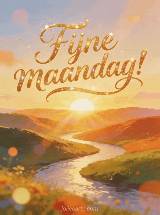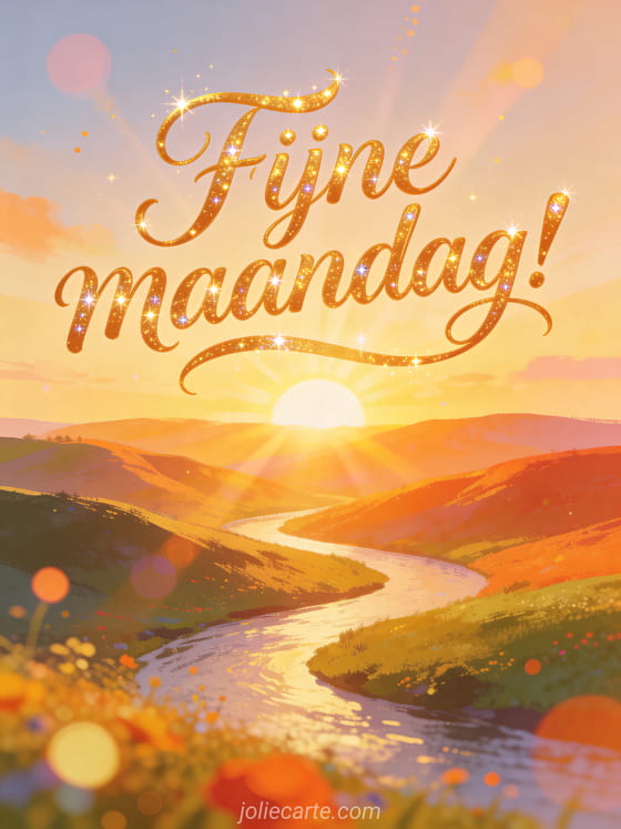 Deel fijne maandag kaarten met vloeiende gouden kalligrafie, een zonsopgang boven glooiende heuvels, een kronkelende rivier en zachte lichtstralen. Stuur ook een fijne maandag gratis virtuele kaart, gif fijne maandag fijne week of fijne maandag geanimeerde afbeelding.