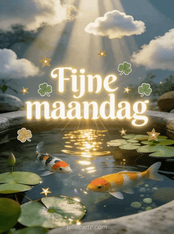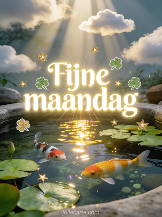 Deel een rustige kaart voor fijne maandag met lichtgevende witte letters, geluksklavers, gouden sterren en een zen vijver met waterlelies. Bekijk ook deze fijne maandag gifs, deze gratis afbeeldingen fijne maandag en fijne week of een sms fijne week en fijne maandag groet.