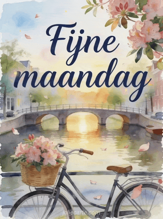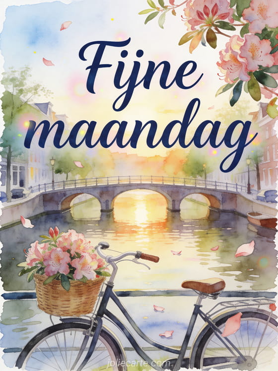 Stuur fijne maandag mooie afbeeldingen met marineblauwe aquarelletters, een rustige kanaalbrug bij zonsopkomst, een fietsmand vol rododendronbloesems en bloemblaadjes over de rand. Misschien vind je ook deze warme fijne maandag afbeelding, deze fijne maandag en fijne week geanimeerde gif gif of deze maandag goedemorgen kusjes gif mooi.