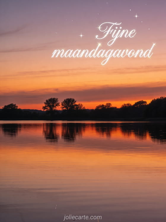 Wens een rustige fijne maandagavond met deze mooie fotorealistische kaart met een oranje en paarse avondlucht die weerspiegeld wordt in een stil meer. Ontdek ook kaart fijne maandag humor of fijne maandag hond.
