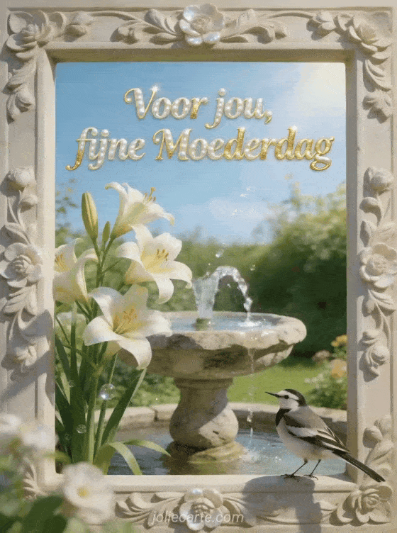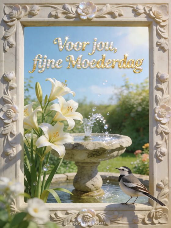 Deel fijne Moederdag afbeeldingen met verfijnde parelletters, gouden glans en een fotorealistische stenen fonteintuin. Een kwikstaart staat naast verse daglelies en sprankelend water in deze vrolijke lentekaart. Ontdek ook Moederdagfoto's, kaarten voor Moederdag of fijne Moederdag voor mijn mama.