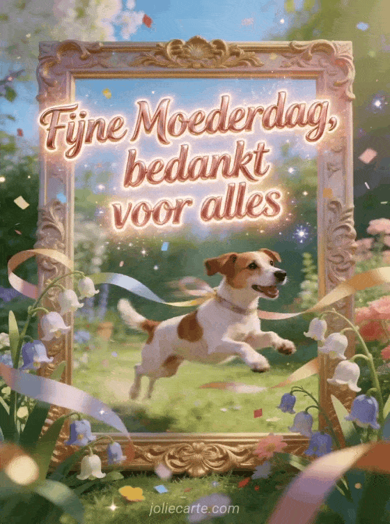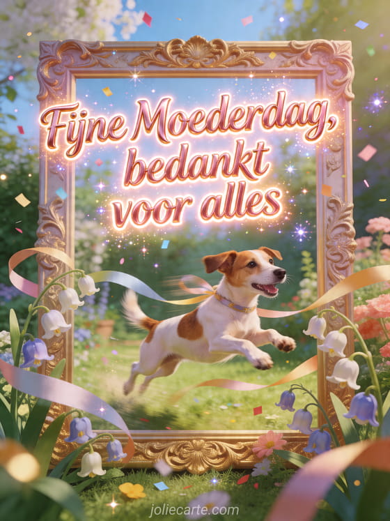 Deel een speelse Moederdagkaart die bedankt voor alles zegt, met een Jack Russell hond die door linten en klokjesbloemen springt rond een gouden tuinlijst. Ontdek ook een gedicht voor Moederdag, afbeeldingen voor Moederdag of een foto voor Moederdag.
