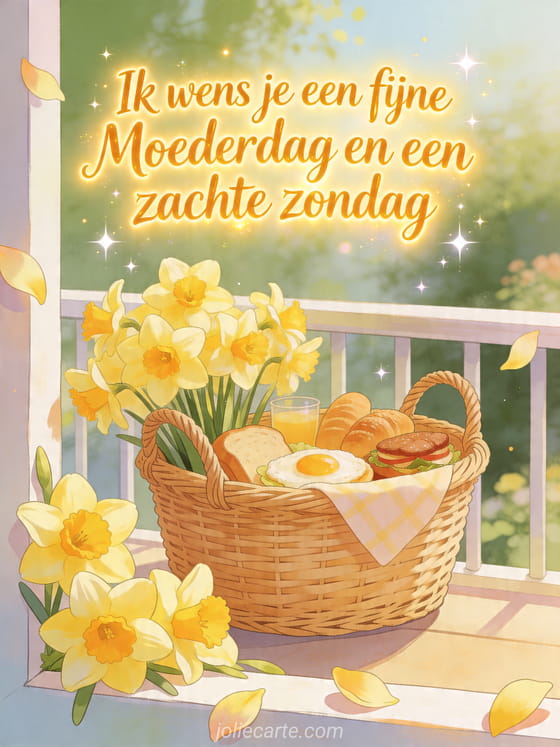 Deel een lichte boodschap voor Moederdag en een zachte zondag, met een ontbijtmand, stralende narcissen en een lentebalkon. Ontdek ook fijne Moederdag overleden mama, citaten voor Moederdag of een citaat voor Moederdag.