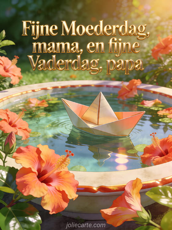 Stuur een evenwichtige familiale groet voor mama en papa met fotorealistische gevouwen zeilboten in een heldere tuinvijver, levendige hibiscusbloemen, glanzende bladeren en feestelijke reflecties. Ontdek ook fijne Vaderdag papa tekst, een gratis kaart fijne vaderdag of zalig vaderdag.