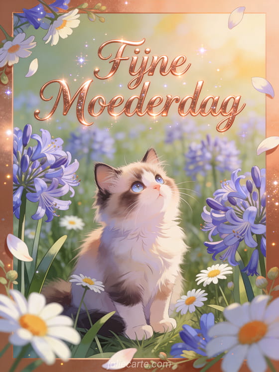 Licht mama's dag op met deze charmante kaart met een Ragdoll kat tussen agapanthus en margrieten in het lentezonlicht. Ontdek ook moederdag bedankt afbeelding of fijne moederdag gif.
