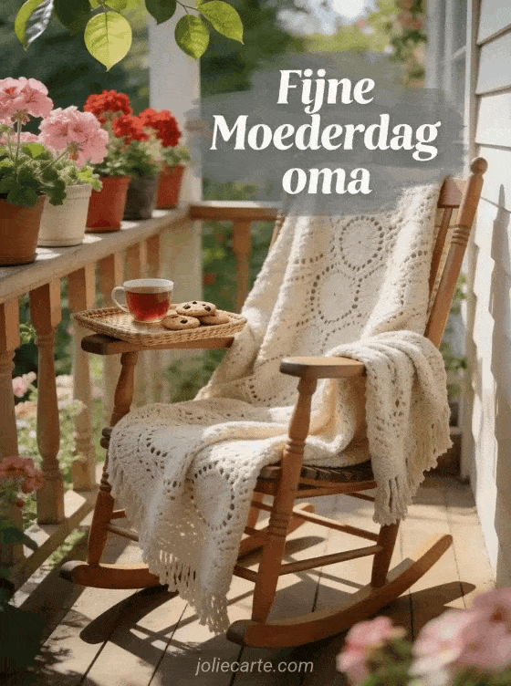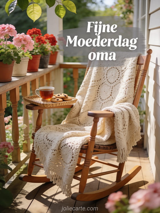 Vier Moederdag voor oma met een tedere en nostalgische verandascène. Bekijk ook gedicht voor moederdag met rijmen, tekst aan mijn dochter voor moederdag en e-kaart moederdag.