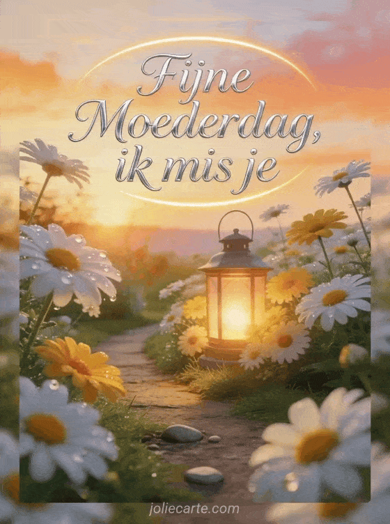 Deel fijne Moederdag overleden mama met fijne zilveren kalligrafie, een warme halo en een fotorealistische gloeiende lantaarn tussen heldere margrieten langs een tuinpad bij zonsopgang. Deze kalmerende kaart zegt ik mis je met tederheid. Ontdek ook citaten voor Moederdag, citaat voor Moederdag of kaart voor Moederdag.