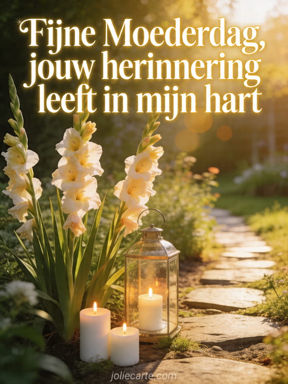 Eer een geliefde mama met een vredige Moederdagkaart waarin haar herinnering in het hart leeft, omringd door gladiolen, kaarsen en zacht tuinlicht. Ontdek ook een Moederdagkaart, gratis Moederdag afbeeldingen of een Moederdag boodschap.
