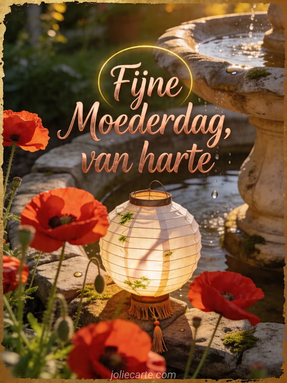 Deel een oprechte Moederdagkaart met scharlaken klaprozen, een gloeiende lantaarn, een stenen fontein en gouden tuinlicht. Ontdek ook Moederdag foto's, een kort gedicht voor Moederdag of fijne zondag fijne Moederdag.