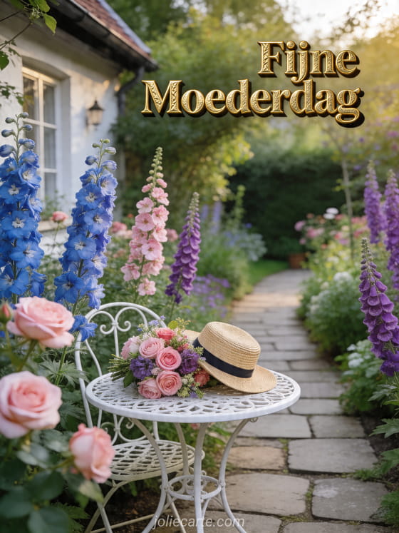 Deel een lichte Moederdagkaart met gouden letters, cottagebloemen en zacht middaglicht. Ontdek ook een kaart fijne Moederdag lieve mama, poëzie over Moederdag of een Moederdagafbeelding.