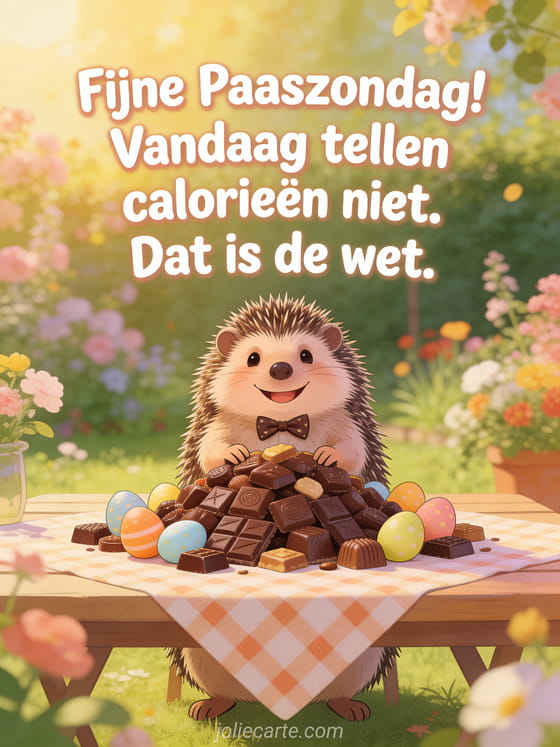 Stuur een humoristische paaszondag-kaart met een egel met vlinderdas voor een berg chocolade. Ontdek ook een grappig vrolijk paasfeest of een kat pasen humor.