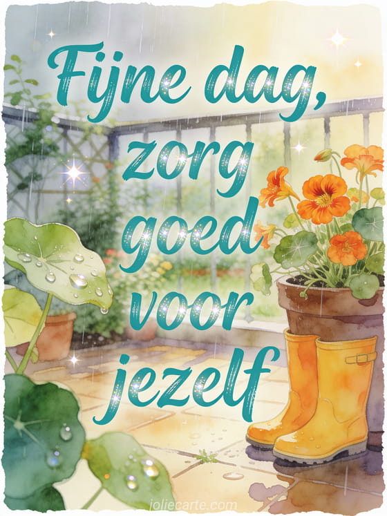 Deel een zachte groet voor een regenachtige dag met turquoise letters, glanzende regendruppels en een rustige tuinsfeer. Deze gratis kaart helpt om iemand aandacht te sturen en te herinneren goed voor zichzelf te zorgen. Bekijk ook een fijne regenachtige dag kaart, een kusjes fijne dag gif kaart of een dikke kussen fijne dag kaart.