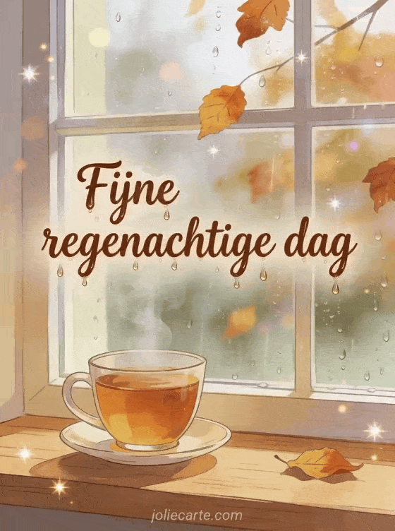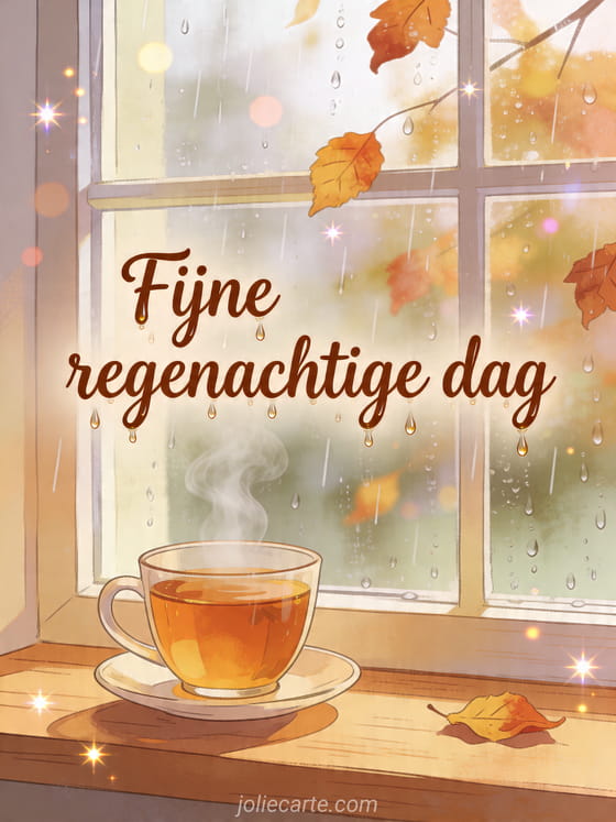 Breng warmte in een regenachtige dag met deze gezellige kaart waarop een dampende kop thee staat bij een raam vol regendruppels en herfstbladeren buiten. Ontdek ook kusjes fijne dag gif, dikke kussen fijne dag of spreuk fijne dag.