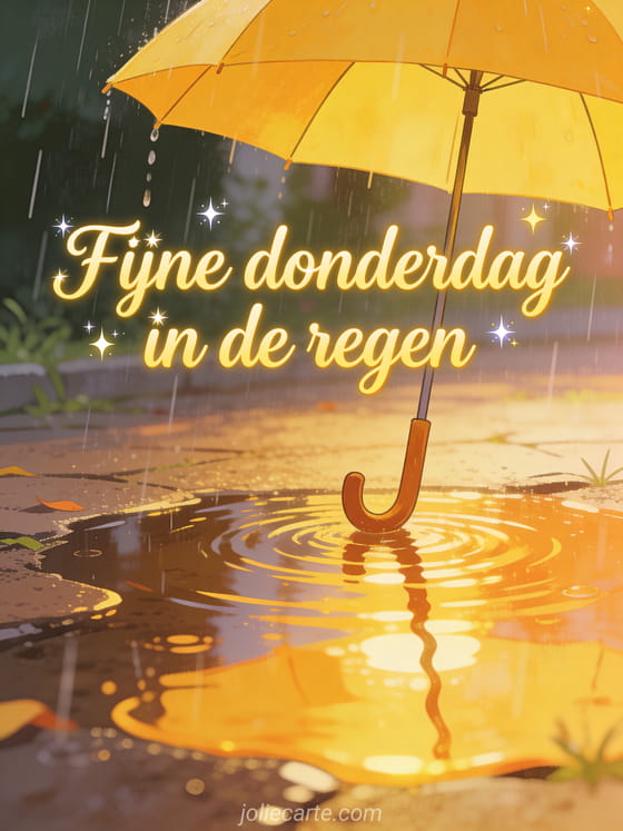 Deel fijne donderdag in de regen met zachte cursieve letters, fijne schittering, een gele paraplu in levendige regen, heldere plasreflecties en knus warm licht. Bekijk ook goedemorgen fijne donderdag sport afbeelding, kaarten om een fijne donderdag te wensen of goedemorgen fijne donderdag.