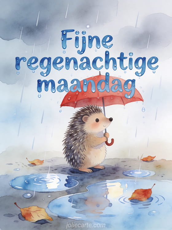 stuur een lieve boodschap voor een regenachtige maandag met deze gratis wenskaart, met een kleine egel onder een rode paraplu in zachte aquarelstijl. bekijk ook afbeeldingen fijne maandag winters, goedemorgen maandag ochtend en maandag lieveling fijne maandag mijn schat.