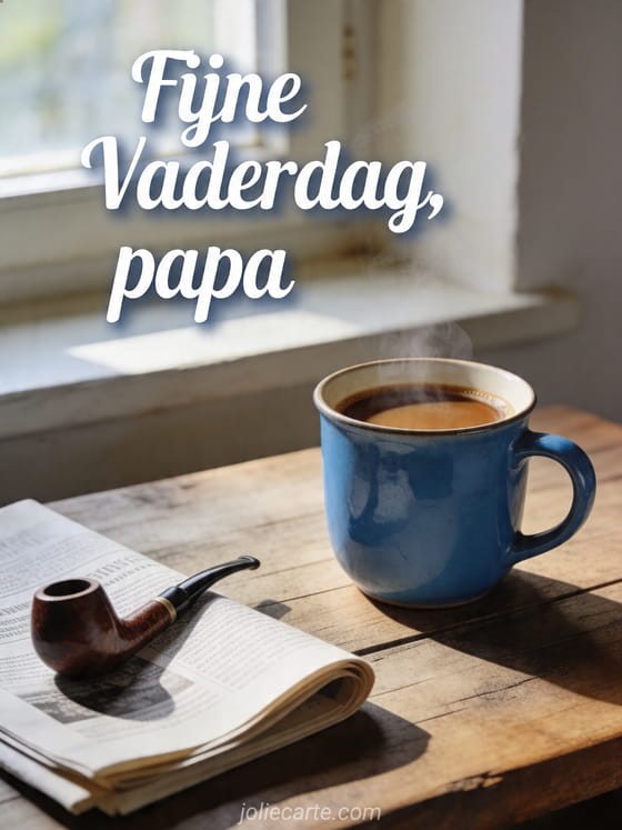 Deel een fijne Vaderdag afbeelding met een dampende kop koffie, een gevouwen krant en zacht ochtendlicht op een rustieke houten tafel. Ontdek ook een fijne dag papa mama, een vaderdag afbeelding of een goedemorgen fijne vaderdag.